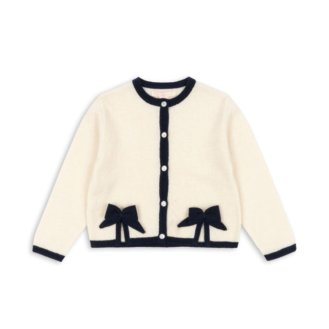 Soft wool cardigan with bow detailing. Classic design with round neck, contrast edges, and mother of pearl buttons. Made from 100% wool