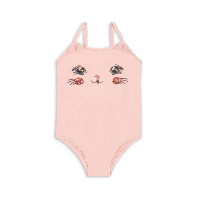 Soft swimsuit that looks as cute as a kitten with a cat face print in front. Crafted in a stretchy and quick-drying fabric, and designed with slim straps, sequins, and cute eyelet detailing along the hems.