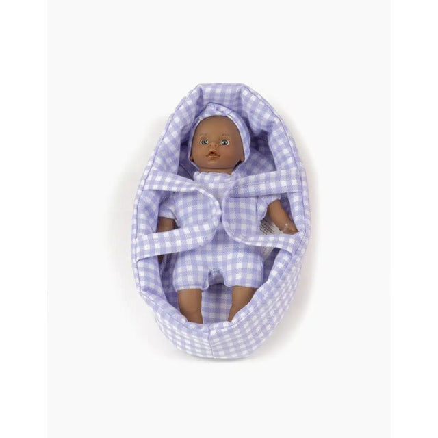 Minikane Mini Doll 17cm - Pia with light eyes and her lilac purple Vichy bassinet