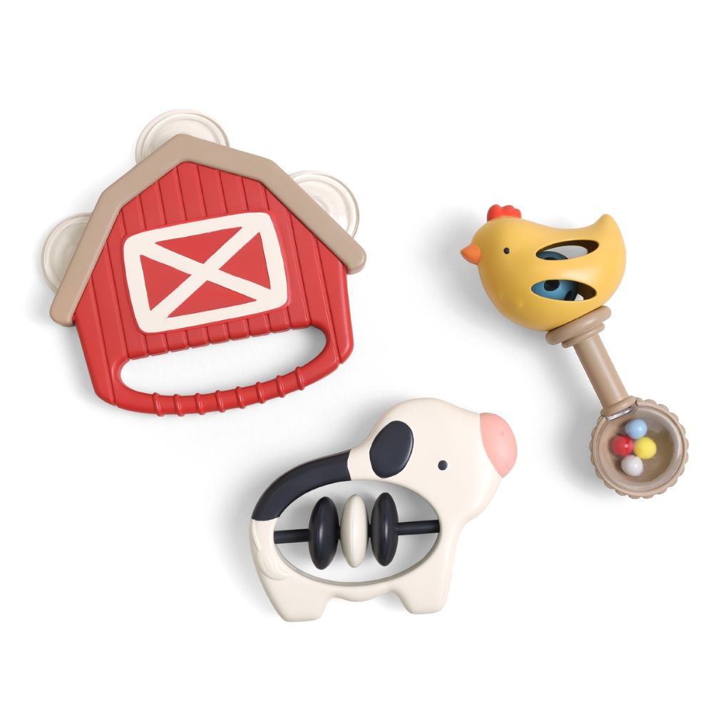The Itzy Bitzy Jamboree music set is made for little ones in their music era. With a tambourine, jingle maraca, and shaker designed for tiny hands, baby will rock out like a headliner. No tickets required. Features - 3 instruments, 3 distinct sounds (with high-contrast clacker beads) for an all-out sensory jam sesh with a fun farm twist - Great for developing motor skills thanks to our easy-to-grasp handles - Encourages rhythm, hand-eye coordination, and tiny rockstar energy