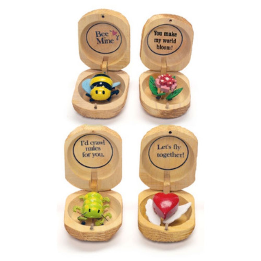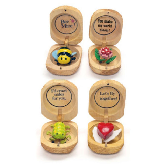 Meet the Love Bugs tiny surprises that come to life with a pop! Hidden inside a wooden case, each critter springs into action the moment you open the lid. From buzzing bees to fluttery ladybugs, every Love Bug delivers a playful pun like Bee Mine or Lets fly together! They're sweet, silly, and full of heart perfect for Valentines Day, small gifts, or just because.