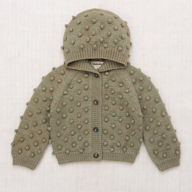 A roomy hand-knit hooded cardigan in our signature all-over popcorn stitch. Featuring a cozy silhouette, a bonnet-style hood with a slight point at the top, ribbed trim and hem, and horn button closure.
