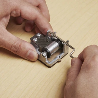 Original hand crank music box. Try on wood or glass or try different surfaces for a new sound. Screws included. Makes a sweet gift.