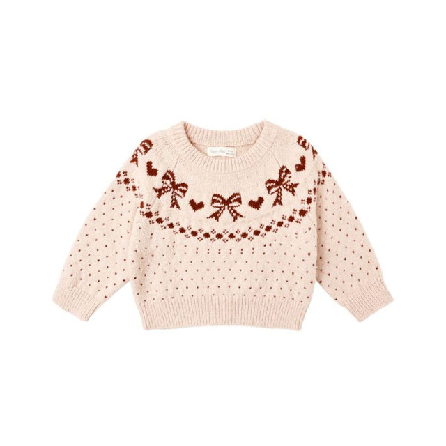 This Fair Isle Sweater is a cozy knit featuring a sweet bow motif and traditional fair isle patterning. Designed in a soft petal base with warm accents, it brings both comfort and charm to everyday wear.